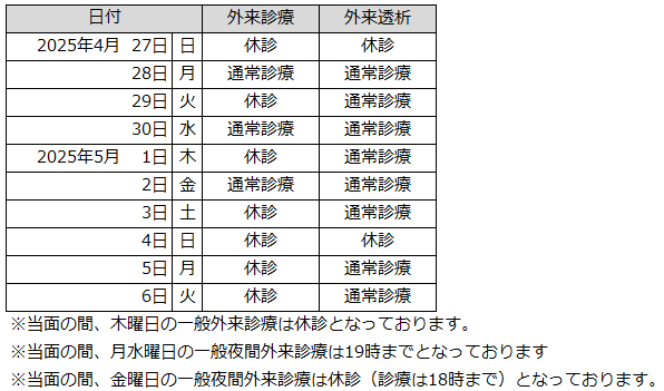 2025年4月27日(日)から2025年5月6日(火)にかけての連休期間中の休診は以下のとおりになります。