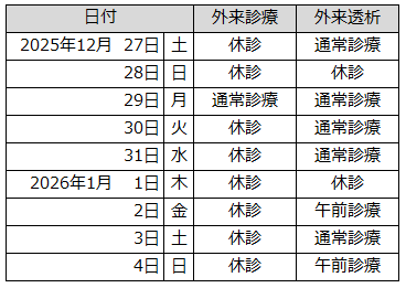 2025年12月27日から2026年1月4日にかけての年末年始期間中の外来休診は以下のとおりになります。
